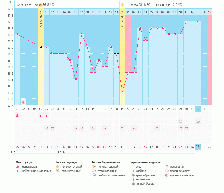 Базальная температура, ТТ, графики БТВот мой график за этот месяц. Было две овуляции, подтвержденные УЗИ. Почему их было две - я не знаю, у меня всегда стоял диагноз мультифолликулярные яичники, но чтобы они так работали, я не ожидала О_о У меня цикл восстановился только месяца четыре после ГВ и сразу начали планировать. Сегодняшний тест слабополосатый, сейчас поеду сдавать ХГЧ. У мужа день рождения через два дня, очень хочется его порадовать :) По ощущениям имплантация случилось 29го числа, так как в этот начал ныть живот, не переставая. Держу пальцы крестиком! На последнем узи, где определили вторую овуляцию, было два желтых тела по 22мм и 20мм в ПЯ, эндометрий 14мм. Надеюсь, прогика от двух ЖТ хватит :)