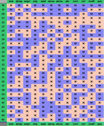 я вам завтра табличку скину сюда)))там слева возраст матери а по верху месяца зачатия ну как я понимаю например мне 22 и значит в октябре ноябре и декабре там стоят девочки значит мне нужно стараться в эти месяца.а в 18 в июне у меня стоит мальчик и мальчик родился)))