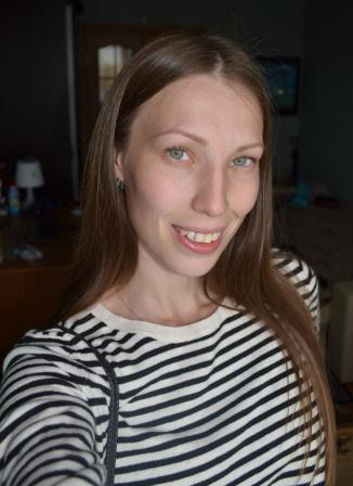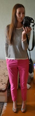 Собралась в магазин. Погода на улице непонятная, поэтому решила не рисковать и утеплиться, одела легкий свитерок и бесформенные брючки яркого цвета. Прическа как обычно распущенные прямые волосы, минимум макияжа - тушь и блеск для губ. В кои то веки напялила каблуки. Вот что получилось: