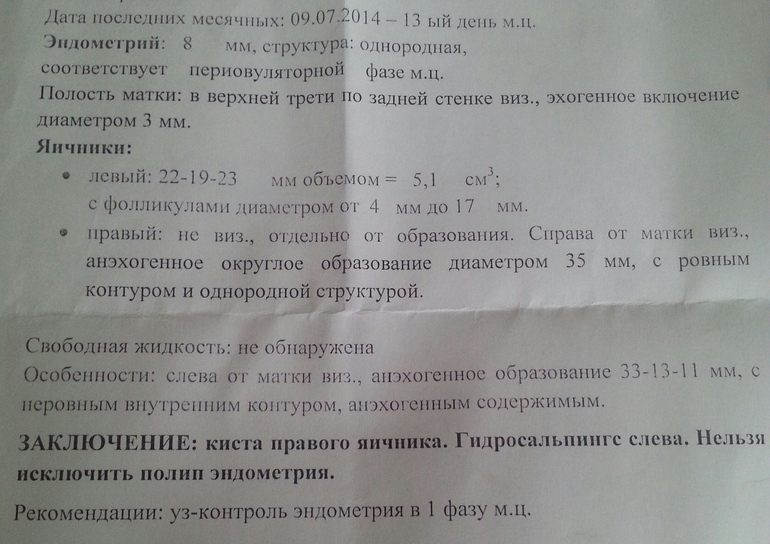 ФолликулометрияВсем привет. У меня сегодня было котрольное Узи после приема препаратов (фемостон и дюфастон). Назначали из-за тонкого эндометрия и для поддержки второй фазы. Так вот вернулась я в шоке. У меня в этот раз были скудные М и пришли раньше на один день. Сегодня 13 д.ц. Оказалось у меня киста яичника ( я не поняла какая, врач неуверенно сказал) Хотя врач один из лучших и было экспертное узи. А что еще хуже, так это подозрение на полип эндометрия (эндометрий кстати вырос)... Никогда ничего из этого не было, всегда были отличные УЗИ... Долбанные таблетки...И еще сказал, что левая труба похоже полна жидкости и непроходима((( У меня она одна после ВБ... Сказал приходить сразу после М и смотреть еще раз, потому что сейчас все непонятно и под вопросом. Как так??? Вот фото УЗИ. Девочки, кто разбирается подскажите, что можно сказать по этим показателям. Фото под кат...