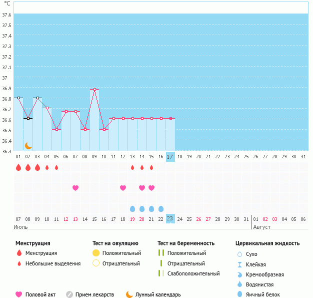 Просто теряюсь в догадках - моя обычно на 15-й день приходит, а сегодня уже 17-й - и тишина (график БТ под катом).. А после того, как я добавила к обычному фитнесу йогу, так еще и живот с поясницей болели несколько дней немного и мазня в середине цикла небольшая случилась... Что думаете?