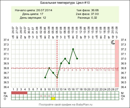 В этот раз опять решила строить график базальной температуры, на сегодняшний день он выглядит так (внизу прикрепила фото). Овуляция вроде бы была, да я ее и чувствовала как никогда)). Сейчас правда уже ничего не чувствую, разве только грудь немного болит, но обманываться не буду, это бывает.