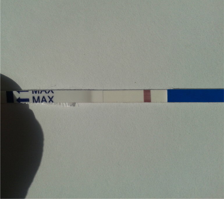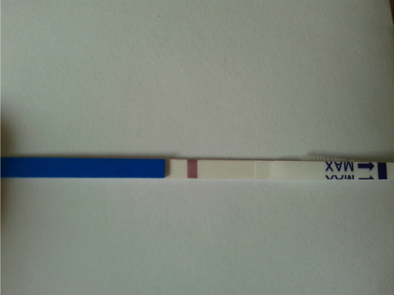 по-моему реагент.полоска тоньше контрольной в 2 раза и белая.по сути видно только место,где должна быть полоска.встречала такое на дешевых тестах.Б ни разу не оказалось(