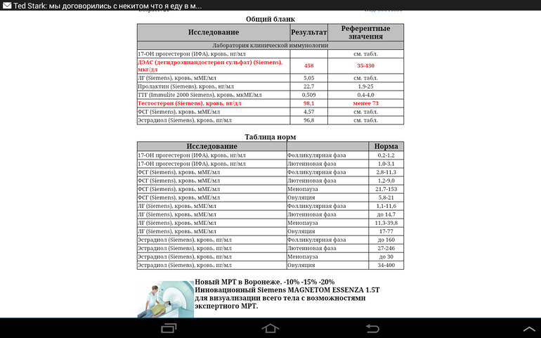 Все в норме, кроме ДЭАС и тестетерона, пролакт н в норме, у меня точь-в-точь такой же, все врачи говорят все хорошо!