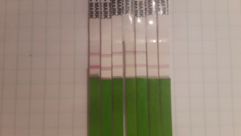 Последний вечерний тест на первом фото последний.а так кроме верхних двух были положительные просто сейчас они сухие и невидно особо