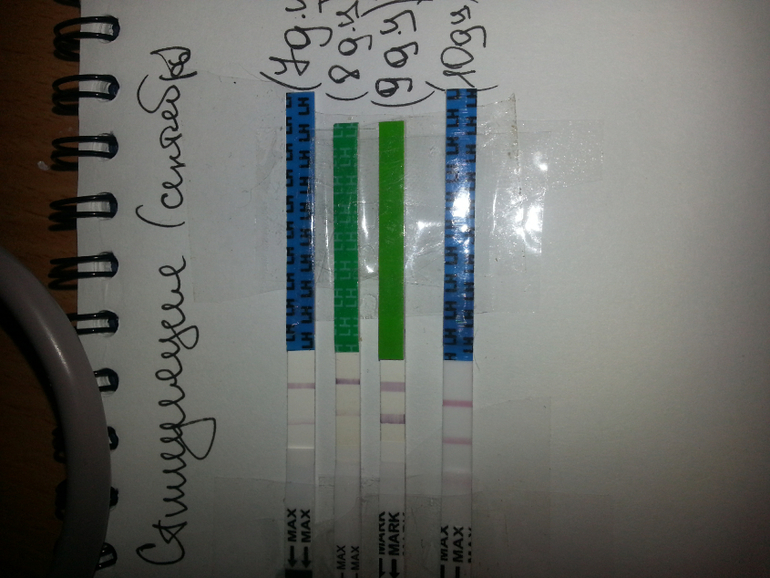 Девочки у меня сегодня 10дц в этом месяце я на стимуляции.Дак вот вчера на 9дц сделали укол Прегнил 10000ед в 13:00.Сказали ПА 21,22,24 числа.Сделала для интереса вчера тест ну я как и ожидала там полоска жирная.Думаю сегодня сделаю,сделала а там она слабоположительная ну как такто???Выделений бообще никаких нет Да и в предыдущие стимуляции тоже выделений никогда небыло.Ни чего не болит ничего не колет Девочки может у меня небудет О(((((((Бля все достало все череж жопу(((Уж простите но не могу душа вырывается(((Не знаю что и думать.