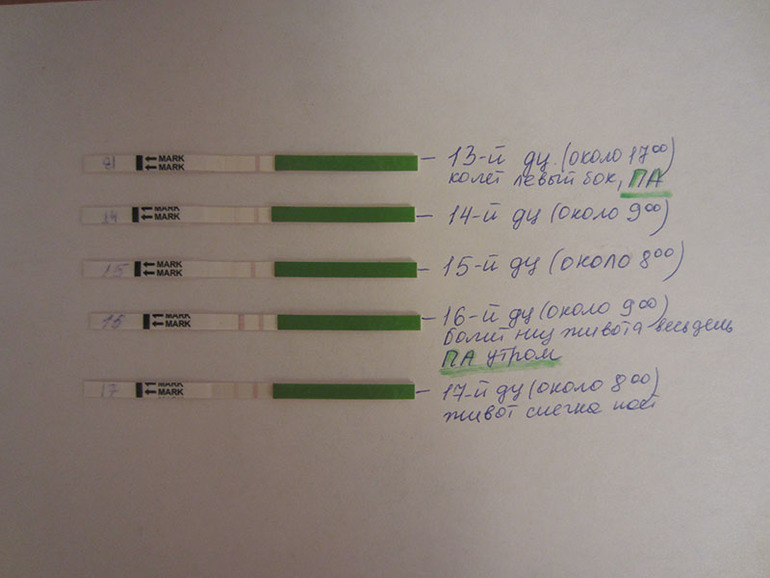 17 ДЦ - вторая полосочка уже бледная стала. Живот ноет, но уже легче. ПА утром не получился, к сожалению .... Будем пробовать еще вечером.