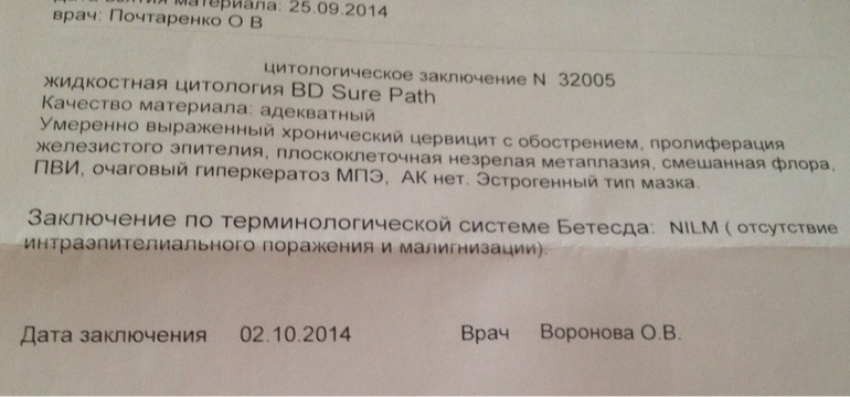 Кольпоскопиядевочки, нужен ваш совет. Сделала кольпоскопию, на месте прижженной сальковагином эрозии (4 г назад) появились белые пятна (как налет), доктор сказала закупорились поры, также нашли кондиломы на входе во влагалище. Взяла обычный мазок (повышенные лейкоциты), на впч (отрицательный) и на цитологию (10 дц), результаты ниже