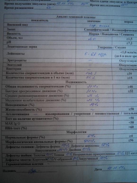 Все нормально и с морфологией и с подвижностью. Прям реанимировали!!! ))))А с лейкоцитами как? Там просто справа обрезано, не пойму, норма или нет.Сколько времени заняло лечение мужа? Это за пару месяцев так все поправилось? Хотя я смотрю у вас и до этого шустрых было 20%. Всего на 10% выросло.Значит, если у нас шустрых почти нет, а именно 2,7%, то через два месяца будет около 13%... Не, я понимаю, организмы разные... Но все же я чет расстроилась.