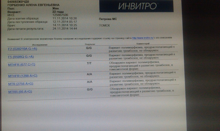 Мне гинеколог назначил, сказав сдать наследственные тромбофилии. Я нахожу в инвитро только комплекс: тромбозы: расширенная панель за 7700 с заключением генетика, без заключения — 6800. В этом комплексе такие же показатели, как у вас. Может в Смоленске все на столько дороже, чем в Томске, но я как-то очень сомневаюсь..;