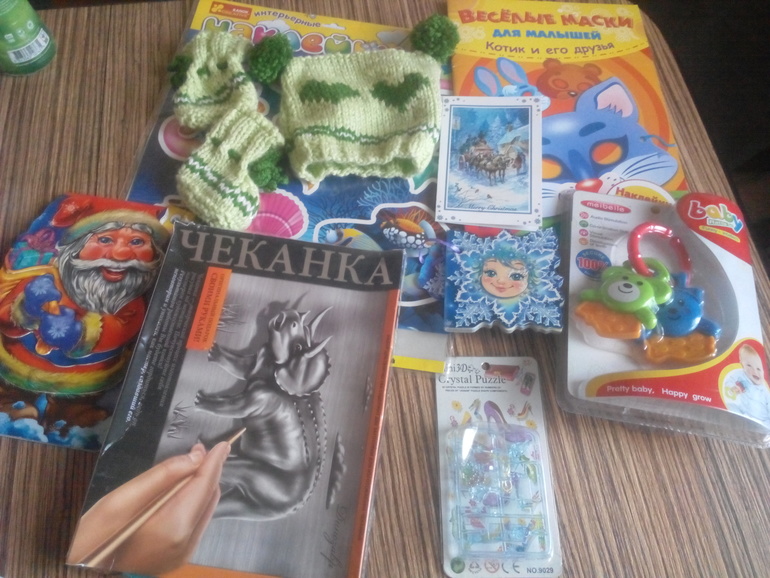 Спасибо огромное Лилия нам все очень понравилось! Носочки и шапочку уже так и хочется примерять, надеюсь уже скоро нам все пригодится! Так приятно получать подарки, на душе появляется праздничное настроение. И спасибо за теплые слова в открытке! Вот сейчас будем ломать голову с доцей собирать пазл. Дочка ходит гирлянду не снимает)))