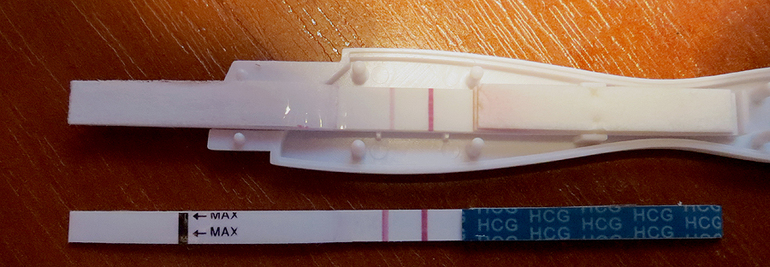 Но вечером купила струйный Эвитест,хотела оставить на память,чтобы хранить удобно было)))И тут он выдает БЛЕДНУЮ БЛЕДНУЮ ПОЛОСУ)Я в шоке)Начинаю перебирать в голове признаки и проверять вдруг че исчезло)ПРихожу к мнению,что всё норм,что подташнивает,что грудь немного так и болит,что выделений нет)Тут же иду делать простой Эвик)Из пачки,где два теста)))Результат был вот такой!Разница между ними 10 минут,блин)А не три часа,как говорят)Фирма ОДНА)Струйные обычно же ярче!