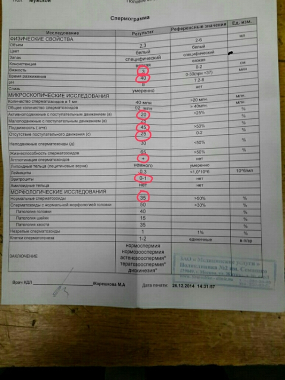 У нас немного получше, но близко плаваем( А уролог сказал — споки, ребята, забеременеете и вообще не охал и не ахал. Но лечение назначил)))