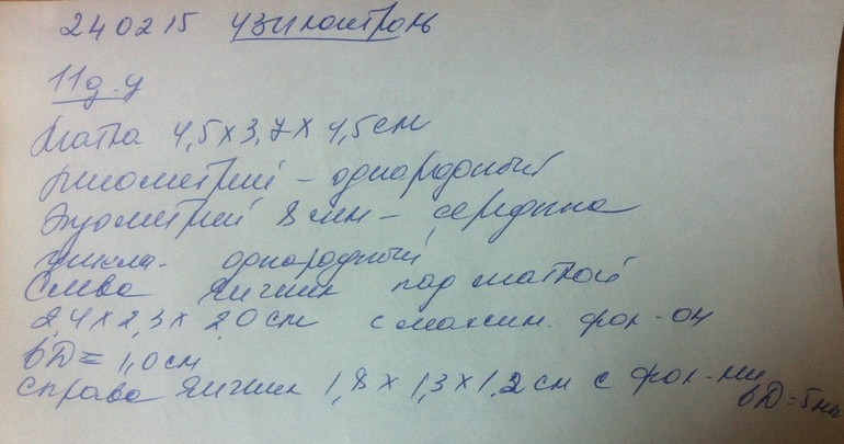 И еще удивило — вы из Москвы и нашли место, где пишут результаты УЗИ от руки? 0.о Я думала, такое только в глубинке возможно( Надо менять клинику и врача, имхо!
