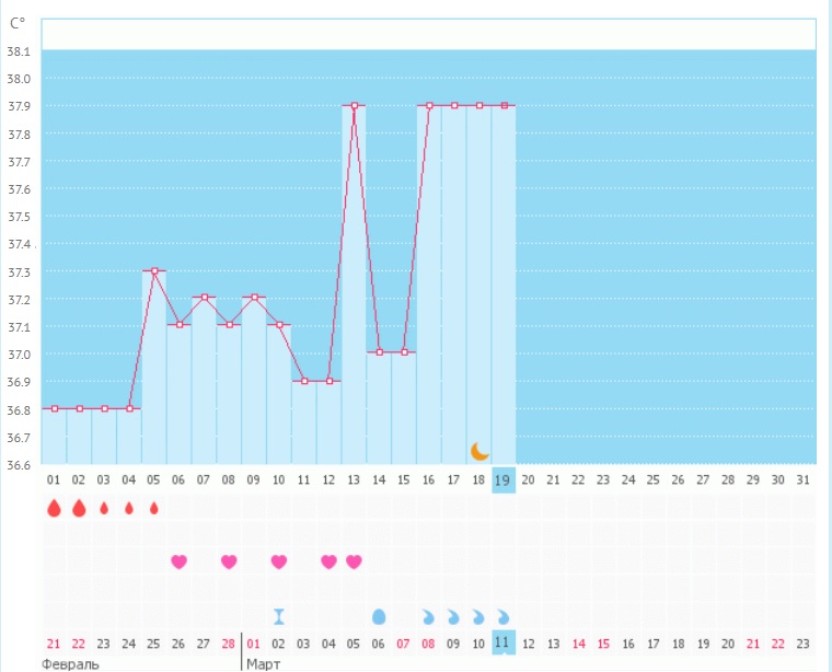 первый мой график БТ мега смачный..сама от него ф шоке...темпа за 38, но прога ставит только 37.9...хотя в инете прочла, что реально может повышаться до 38.6 где-то так...