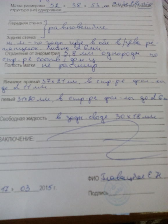 а вас не насторожила свободная жидкость в заднем своде матки — это ведь не норма в первой фазе.обычно это признак воспаления, но может быть что-то другое.
