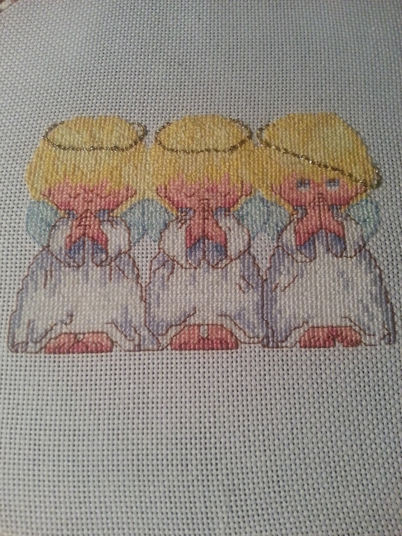 я вот по этой схемке вышивала, очень удобно считать по ней, начинала с серединки — ручки среднего ангела сначала вышила, чтобы понимать, где середина. Эту схему как и многие другие можно найти в яндекс картинках — просто набирите "схема почти идеальный", а по цветам нитки DMC: Blanc, 3078, 341, 760, 353, 434, 744 + золотая нить+голубая с блестками для крылышек