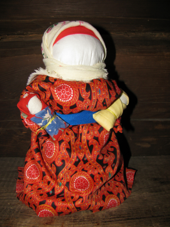 Берется березовое поленце, обматывается тканью. Привязывается головка, набитая ветошью или синтепоном, ватой. Наматывается сарафанчик и под него подкладывается пышная грудь. Деточки делаются из ткани, свернутой в рулетик и запеленутые. Ооочень много вариантов ее создания, простор для фантазий! Главное нитки и ткани рвать ручками, тогда куколка будет сильной!