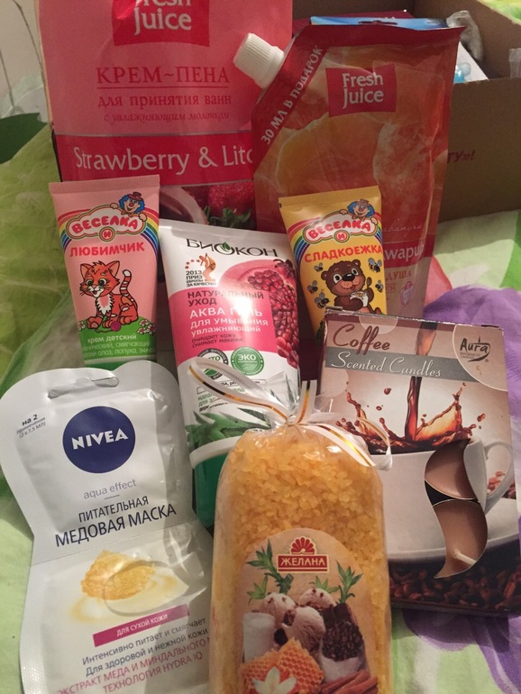 Все на мой вкус и все как я люблю))) Забрала свою посылочку, такая тяжеленная коробочка была)) Открыла и аж ахнула там стоолько всего)) И все такое класснючее и милое)) Много приятностей мне и пенка для ванн и гель для душа и детские кремики и масочка и умывалка и свечи для романтика