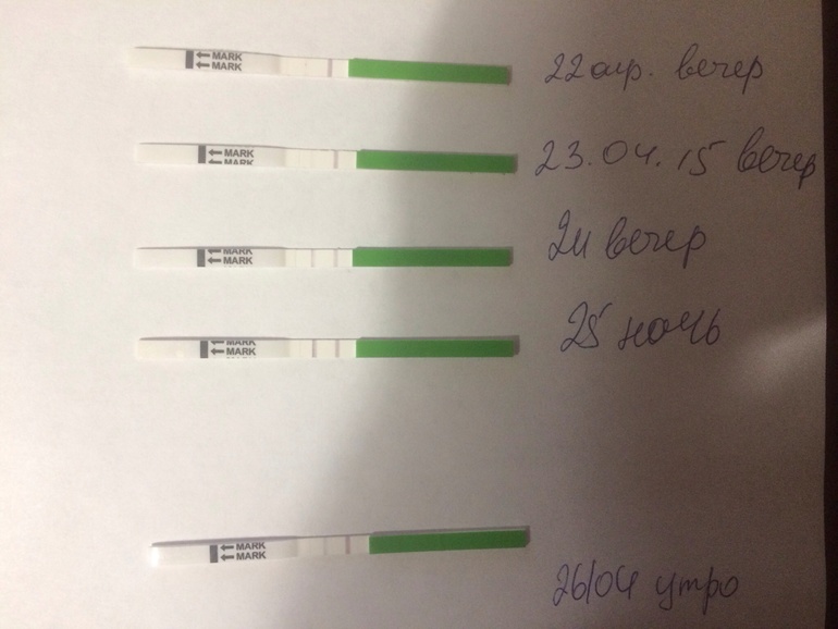 Тест от 25го ( самый яркий) сделан ночью, в 12ч,тест от 26го - часиков в 10утра (судя по окраске полоски О уже прошла)