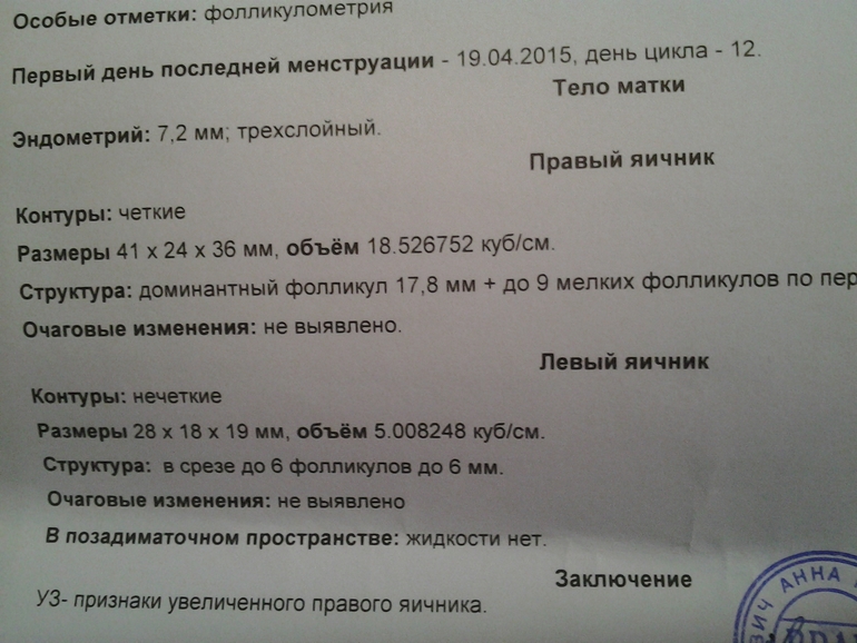 Все у вас хорошо, через несколько дней будет Овуляция, эндометрий хороший и еще подрастет к О. Овуляция будет в правом яичнике. Ничего страшного, что он увеличен, там же доминантный фолик) Удачи!