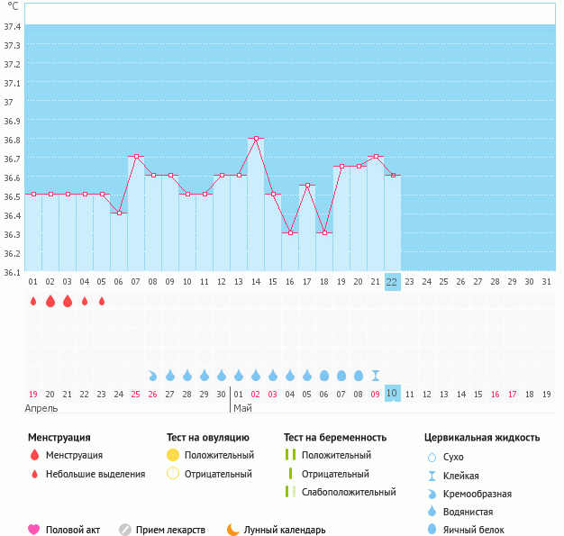 если честно, то сейчас даже не важно , что она прошла, пока муж далеко, я для себя веду. хоть бы вообще была)) А 36.8 — это выходной день был, я мерила в 9-30 утра, да и ЯБ был вчера посл.раз...