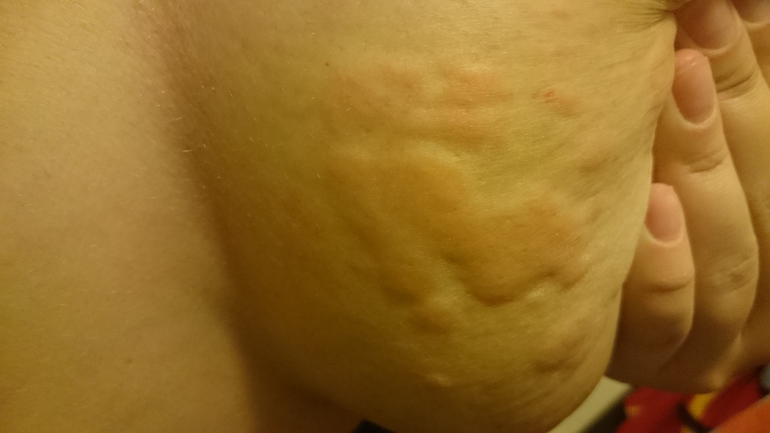 Похоже на крапивницу, аллергия. Супрастин или тавегил и мне назначали уколы кальция какого-то и еще что-то не помню уже. В любом случае ко врачу надо