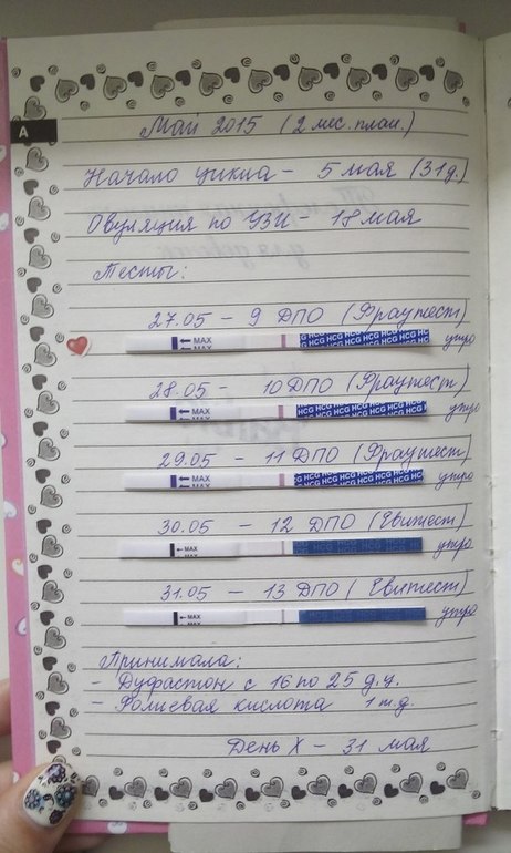 Ждем дня Х (Признаки беременности / Тесты)Точнее отсутствие динамики) Для тех девочек, которые переживают за слабые полосочки, как видно с 9 по 13 ДПО вообще кристальная чистота, со спокойной душой и чистым тестом отменила Дюф. и ждала М., но начавшаяся 02.05 мазня так ни во что и не перешла и тест выдает слабую вторую полоску, которая на следующие дни только таяла на глазах, но ХГЧ вернул меня к жизни)))