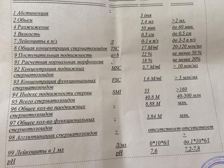 Маленькое кол-во сперматозоидов, мало сперматозоидов с нормальной морфологией, мало подвижных... В принципе, Вы сами можете увидеть это, сравнив Ваши показатели с нормой из последней колонки. Вашему мужчине нужно менять образ жизни. Конечно, не открою Америку, но все же посоветую: если курит-бросить, никакого пива (категорически, этот напиток-смерть для сперматозоидов), если очень хочется выпить- можно немного красного сухого вина. Отказаться от походов в сауну и принятия горячих ванн, окунание в прорубь- тоже нельзя. Больше двигаться. Пусть на работу пешком ходит. Очень полезно плавание, велосипед. Побольше свежего воздуха. Витамин Е, фолиевая кислота, аскорбинка, цинк. Это самые главные витамины для сперматозоидов. Удачи!