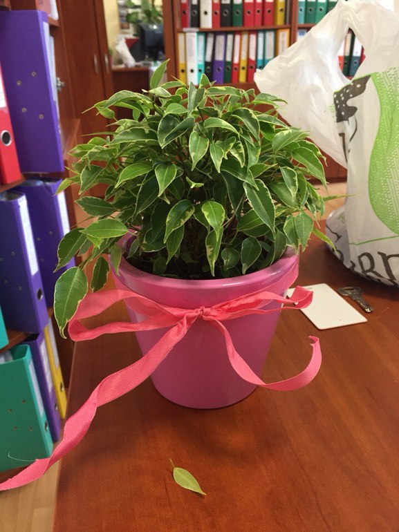 Сегодня у меня последний день работы на госслужбе и начинаю восстанавливать свою нервную систему, готовится к нормальному планированию без нервов))) по этому поводу моя беременная коллега подарила мне фикус в розовом горшочке с розовой ленточкой, зная как мы мечтаем о дочечке)) Божечки как же приятно!!!!!Назвала фикус Сашенькой!!!