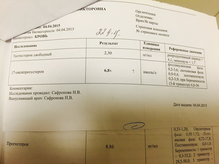 АнализыДевочки, подскажите!!! Обследование прохожу в платной клинике! Все анализы, которые сдаю по направлению приходят сразу к моей Г, она сама их подклеивает в карту, копий никаких не делают(кроме УЗИ), карта естественно у них! Так вот я в этот раз пока сидела перед кабинетом, успела сфоткать на тел все анализы! И что я обнаружила! Что 17- оксипрогестерон помечен черным и стрелочка вверх, то есть повышен?!(фото прилагаю) гормоны сдавала еще в апреле, на 7дпо, моя Г не обратила на это внимания. А я сегодня начиталась, что как раз из-за повышенного гормона проблемы с зачатием! Моя Г сказала, что с такими показателями Б и проблема не во мне, продолжайте лечить мужа! Хотя у мужа я бы не сказало, что совсем все плохо-подвижность 51%! Здесь и не с такими показателями Б! Менять врача? Или действительно не всё так плохо?... Не получается заб уже почти 2 года!