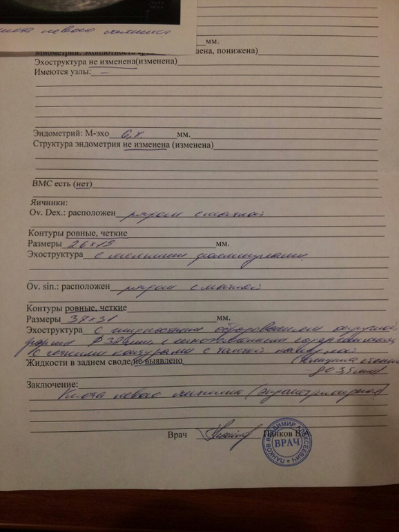 Девочки,писала уже спрашивала здесь по поводу овуляции,первое узи в прошлую среду на 13 дц было,узи по животу,врач дф не увидела,потом на 15 дц по графику бт и тесту,ощущениям была овуляция,вчера был 19 дц,узи делала у другого врача,прикрепила сюда результаты,сказал эндометриоидная киста,своему врачу написала,она сказала скорее всего киста желтого тела,так как не могла эта киста появиться за 6 дней.Кто разбирается посмотрите какая все таки может быть киста?