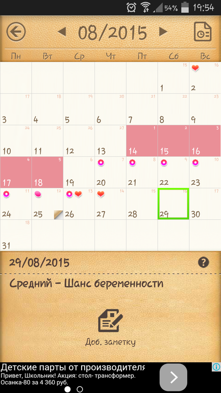 А у меня М должны примерно 12-14 сентября прийти. Сегодня по такому же календарю у меня 15 день цикла...Вчера делала тест на О, показал отрицательный. Сегодня утром был незащищенный ПА (первый раз попробовали) и вот после этого весь день ноет живот,грудь стала болезненной и выделения прозрачные....Сижу и гадаю...сегодня тоже делала тест на О...отрицательный... а у вас ПА был?26 и 27го как я поняла?