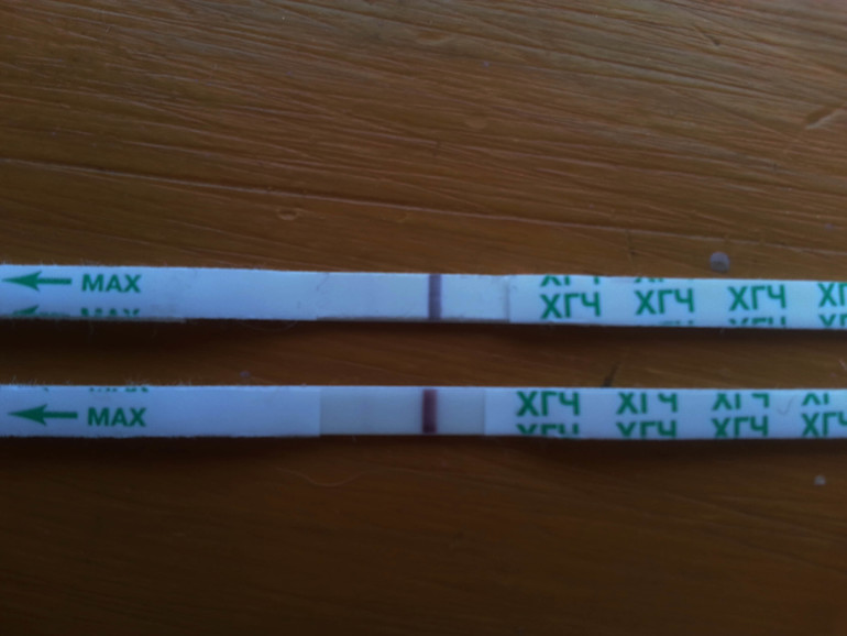 Сегодня тест повторила- никакой динамики, снова что то вроде есть. Но ничуть не ярче. Это почему, это реагенты?( или просто ХГЧ еще не успел вырасти?
