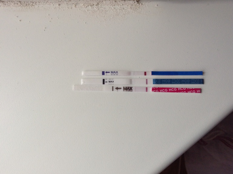 радости моей не было придела ,в этот день и карты мои веселые прям были ,но чуяла я что то не так пойдет ,спросила есть ли угроза они сказали да есть мол принимай утрик и я начала принимать да поздно блин(ну ладно ,в общем в ночь на 8 дпо чуть не вырвало меня ,тошнило жутко ,на утро спросила говорю бер ли они говопят да мол беременна но угроза большущая ,я пошла замочила тесты утром фигня фигней бледные ,и решила замочить в обед (напомню,все бер у меня всегда в обед ярчали )замочила разных три и на всех три полоски ,на фото опять же можете не увидить