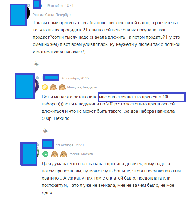 Я ничего не раздуваю. Просто Вы пишете "Как с таким злом в душе можно стать матерями". С каким злом? У кого зло в душе? Одна девушка всех обманывала, нараспродавала ниток по 250 р около 400 штук, девочки увидели несостыковку, закралась мысль об обмане, ее напрямую спокойно спросили о количестве, и понеслась. А как девочки должны были поступить? Не реагировать? Пройти мимо. Или как? Это еще спасибо надо сказать, вон скрины вывесили, у меня теперь даже тени сомнения не возникает. Действительно получается человек просто нагло врал. Вообще хотелось бы от нее поста, что мол извините девочки, бес попутал, простите все меня.. Я бы поняла. Но говорить в ответ "Вы злые!" Я не понимаю реально. Тогда все полицейские тоже злые, нехорошие люди, обижают мошенников и воров. Девочки не полицейские, но спасибо за то, что мимо не прошли.