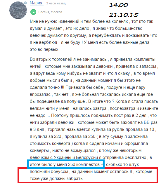 Также в первом фото мы видим в красной рамке, что нитей у нее всего 8, но все уже забронированы. Однако весь день продолжалась бойкая торговля в сети этими нитями, и было продано (обещано) больше 8 нитей в тот день. То есть нити множатся, но КАК? А ведь за много дней до этого поста Мария писала всем "ДЕВОЧКИ, СКОРЕЕ, НИТЕЙ ВСЕГО 3 ОСТАЛОСЬ!"