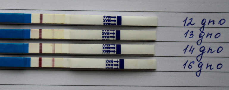 Вот мои: 12,13,14 и 16 дпо... беспокоюсь из-за 16 дпо (т.е. сегодня)... достаточно ли он поярчал за два дня? И поярчал ли вообще?