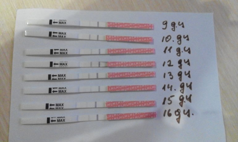 Здесь ситуация не стандартная, слишком часто тесты полосатятся. У Елены начало заметно полосатиться на 10 ДЦ, потом 12-13, потом 18. Можно начать с 10 ДЦ, а затем прийти когда узистка скажет. О ведь не всегда в середине цикла, может быть и ранняя и поздняя.