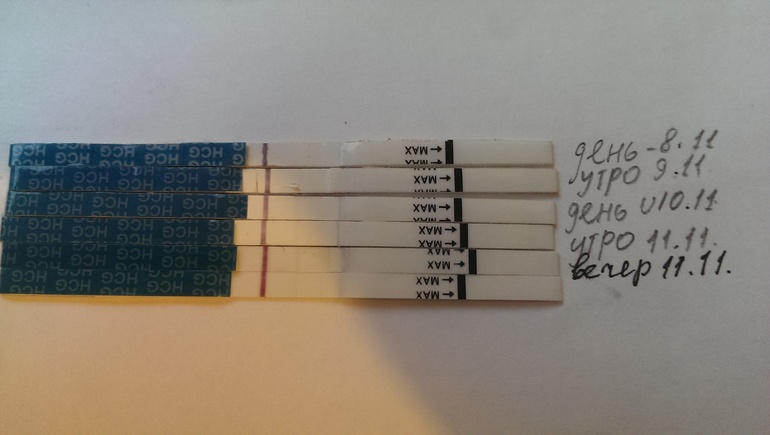 Так, это с 9 дпо, по 15 дпо. Какие-то из тестов сделаны в один и тот же день, не помню какие. Между какими-то еще и перерывы есть в 2 дня. Без последних двух тестов если представить, вообще бледнота. Если вам видно, они ярчали скачками. Поярчают в один день и так три дня держутся, потом опять ярчают. Сейчас у меня тесты такие, как последний, но когда мокрые, полоски почти одинаковые.