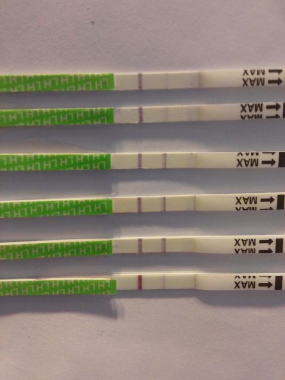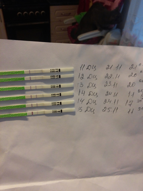 Так вот, тесты начала делать с 11 ДЦ, по всем календарям овуляция у меня на 16-17 ДЦ, но посмотрите плиз тесты, по идее, самая четкая полоска была вчера вечером (17:30), это 14 ДЦ, а уже где-то в 22 часа начал тянуть живот и ПЯ, грудь болезненная, ну и попозже увидела ЯБ. Вот когда все-таки О, вчера или сегодня?? Болит во время О или как предшественник??