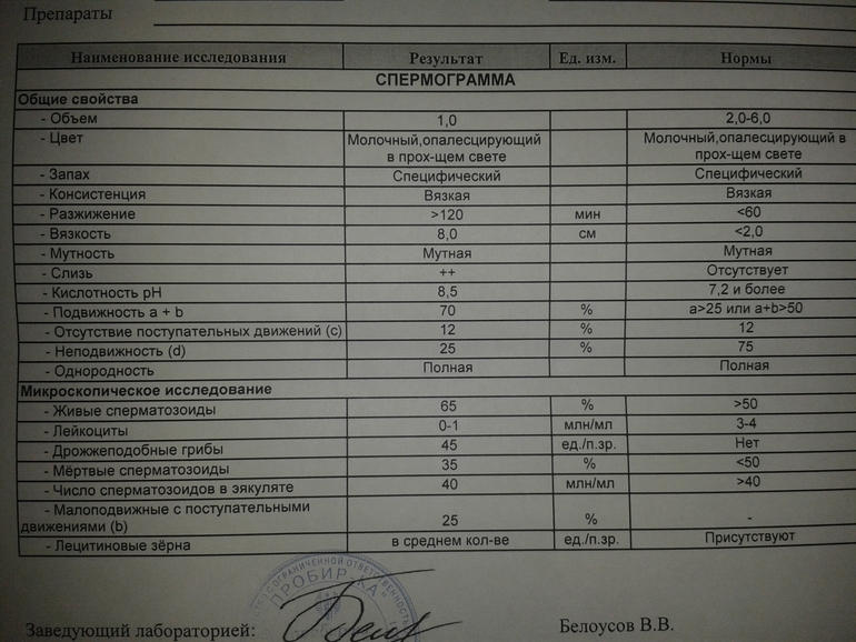 сг больше в этой лабе не делайте, она неполная нет сколько спермиков в 1 мл - а это главный показатель. нет количество А подвижность еще у вашего мужа молочница, дайте ему 1 капсулу флуконазола и через 3 дня снова 1 капсулу флуконазола по 150 мг либо к врачу, если заметит грибы.