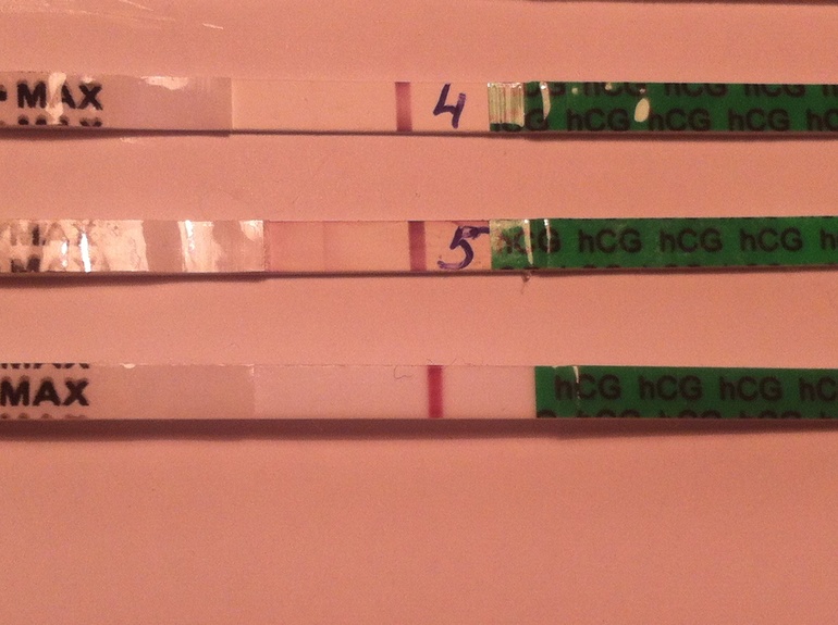 На 5 хорошо видно,на 4 слабо,а на другом виден прапрадедушка призрака)))но все же есть немного)))повторие еще на свежую утреннюю мочу)))удачи вам)