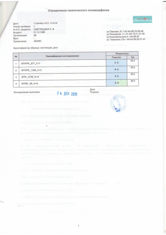 В данном случае нужен ещё гомоцистеин , так как он в прямой корреляции с мутациями мтрр ( не усвоение фолатов и витамина в1,6,12). Консультация гематолога нужна.У меня такие же мутации, если в норме гомоцистеин, то и фолька достаточно... А вот если более 5,5, то нужно принимать Ангиавит .Проблемы у меня начались с 17-18 недели б сейчас на клексане.