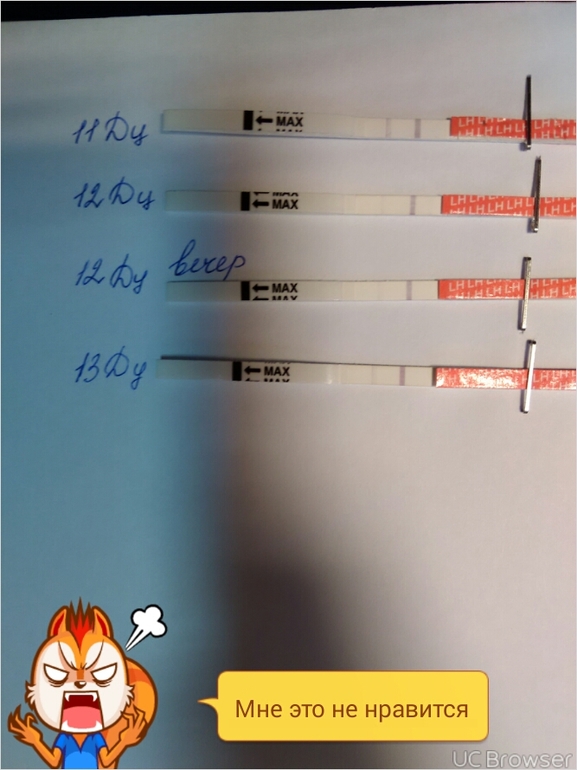 Овуляция( тесты на овуляцию)Ну сделала вчера вечером тест на О, он точь в точь, как и днем. Сегодня ради интереса продолжила. Сегодня ярче чуток чем вчера, но бледнее чем на 11дц.