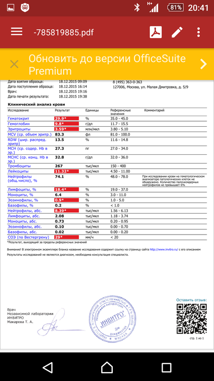 По крови: так же воспаление, ( повышены нейтрофилы и общее количество лейкоцитов, плюс понижены эритроциты - из за чего и гемоглобин с гематокритом тоже упали)