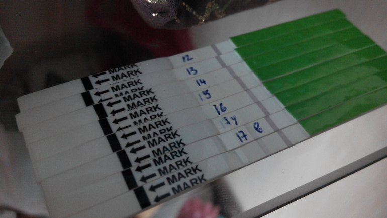 Овуляция( тесты на овуляцию)В общем, весь месяц загоняламь по тестам на О, и вот что они мне выдали. Ярче ничего не было.