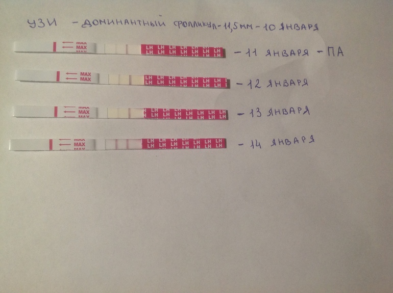 Овуляция( тесты на овуляцию)Всем большой привет! Очень нужна ваша помощь! Итак, при цикле в среднем 28 дней, была я у Г. на УЗИ для осмотра после лечения. Заодно она сделала УЗИ, на котором был виден доминантный фолликул размером в 11,5 мм.. Узнала тут у девушек, что фолликул растёт примерно 1,5-2,0 мм. в сутки. Со следующего дня после УЗИ я начала мочить тесты на овуляцию, результаты ( прошу прощение за почерк и оформление