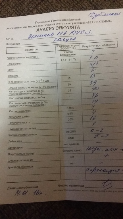 По ВОЗ нормы есть, но они больше раписаны для тех кто на ЭКО идет и для ЭКО они подойдут, но вот для естесств.заберемения нужны другие нормы. У нас центре планирования кол-во сперм. в 1 мл должно быть более 20 млн/мл. общее кол-во сперм-в должно быть более 40 млн/мл (но это самая нижняя граница нормы). лучше больше их. Такое ощущение, что выработка живчиков не происходить полноценно и что-то в этом мегшает (а чтобы понять что, надо сдавать доп.исследования: мазки из уретры и бак посев сока простаты, трузи + узи мошонки). Общее кол-во прогрессивно подвижных должно быть более 50%... (у вас 40%). Есть агрегация и лейкоциты очень сильно завышены... а это скорей всего где то есть воспаление. про деффективные спермотозоиды у вас написано (головки , хвоста) , а сколько нормальных живчиков - ни слова...Итог: для начала я бы пересдала еще где-нибудь СГ. По 1-й Вам андролог ничего не сможет сказать. Затем с 2-мя СГ идти к андрологу. Я ждала 1,5 года пока мой муж решиться сдать все возможные анализы свои, чтобы найти причину нашей низкой подвижности. Надеюсь, что вторая СГ будет лучше и Вам не придется уговаривать мужа на доп.анализы)