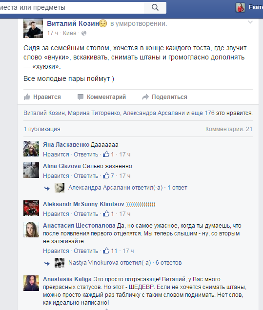 И вот, он пишет пост. Простите, грубоватый, да. Но когда уже достанут до точки кипения... Вот я его понимаю совершенно. Ну и само собой, 99% прекрасно тоже его понимают и поддерживают. И вот, куча комментов согласных, я тоже вот пишу свой коммент, что ещё круче, когда не только родственники, но и друзья лезут с вопросами. Одна девушка советует, как ответить с юмором и поставить в неудобное положение вопрошающих)))) (Пы.Сы.: взяла на заметку про Пугачёвых-то
